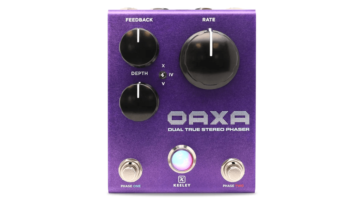 Keeley’s new U.S.-made, digital Oaxa twin phaser can feel nearly as simple and straight ahead as two Small Stones running side by side, and honors the elegance and ease of that solution in many ways. There’s just three knobs—for rate, feedback, and depth. A small 3-position toggle switches between 10-stage phase, 4-stage phase, and a Uni-Vibe-style mode. Two footswitches select between the individual phaser or a combination of the two. If you want to keep things simple, you can dive in no further than that and have a great time. But Oaxa bears many secrets for deeper diggers.