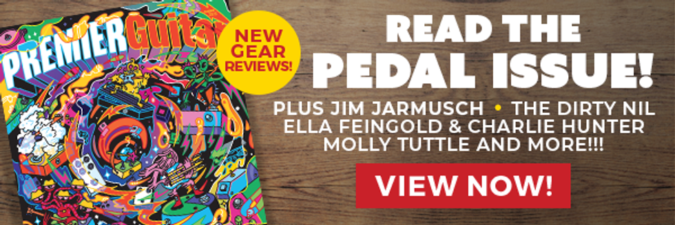 Out onstage at his feet, Toro keeps a pedalboard with a TC Electronic PolyTune, a custom RJM Mastermind PBC/6X, Ibanez TS808, Bowman Audio Bowman Overdrive, EHX Micro POG, Boss TR-2, MXR Carbon Copy, and Strymon BigSky.