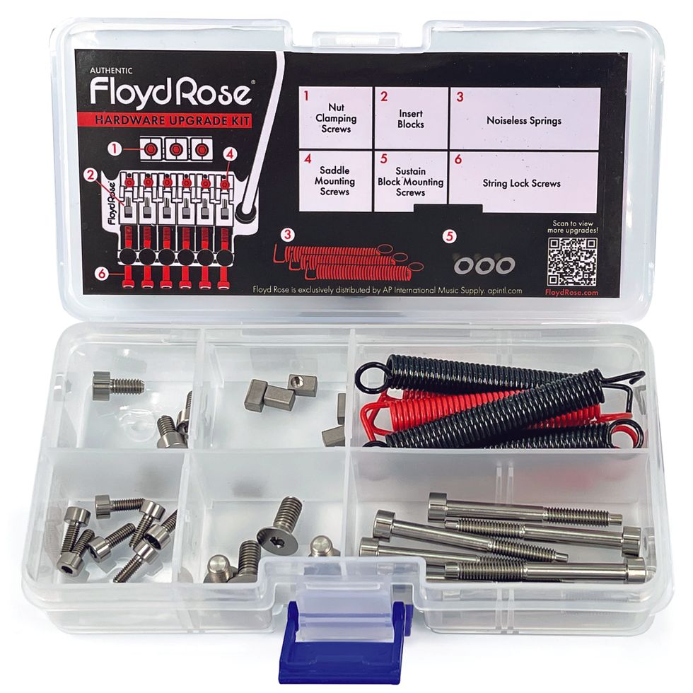 Introducing authentic upgradable hardware kits for FR Tremolo Systems, available in eight stainless steel finishes as well as titanium. Each hardware upgrade kit comes with seven string-lock screws, seven saddle-mounting screws, four nut-clamping screws, four block mounting screws, and string lock insert blocks.