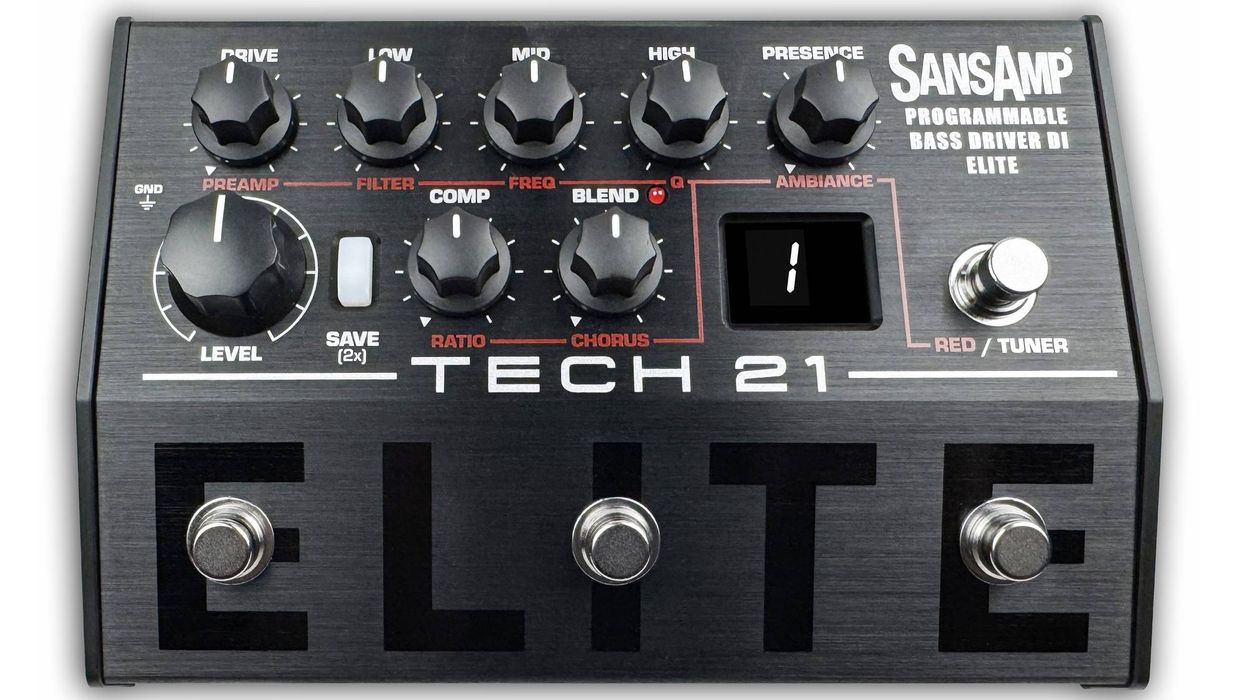 The SansAmp Programmable Bass Driver ELITE has two modes: Performance mode to have your 3 main presets at the ready and Studio mode for up to 128 locations for custom presets. Controls include Drive, Presence, Blend, Compressor, 3-band active EQ, and Level.