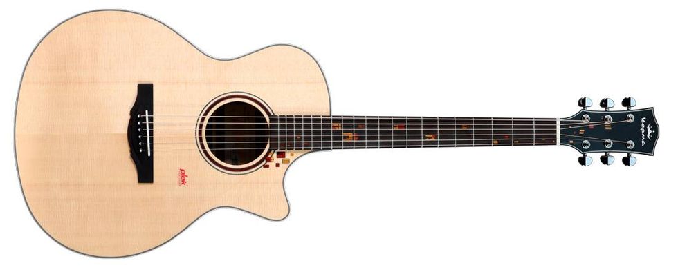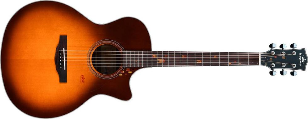 - F2S Lamplight Grand Auditorium acoustic-electric guitar featuring a solid torrefied Sitka spruce top, torrefied bracing, Ovangkol laminate back and sides, L1 Smart Loop Acoustic Exciter Pickup System, Plek® setup and premium Padauk and Boxwood inlays.